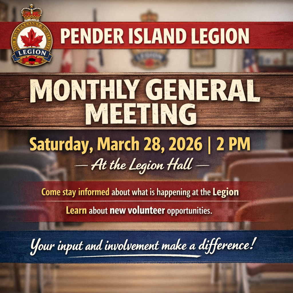 Cheque payable to RCL 239 – drop off in folder at Community Box, or mail to 1344 MacKinnon Road, Pender Island, BC, V0N 2M1